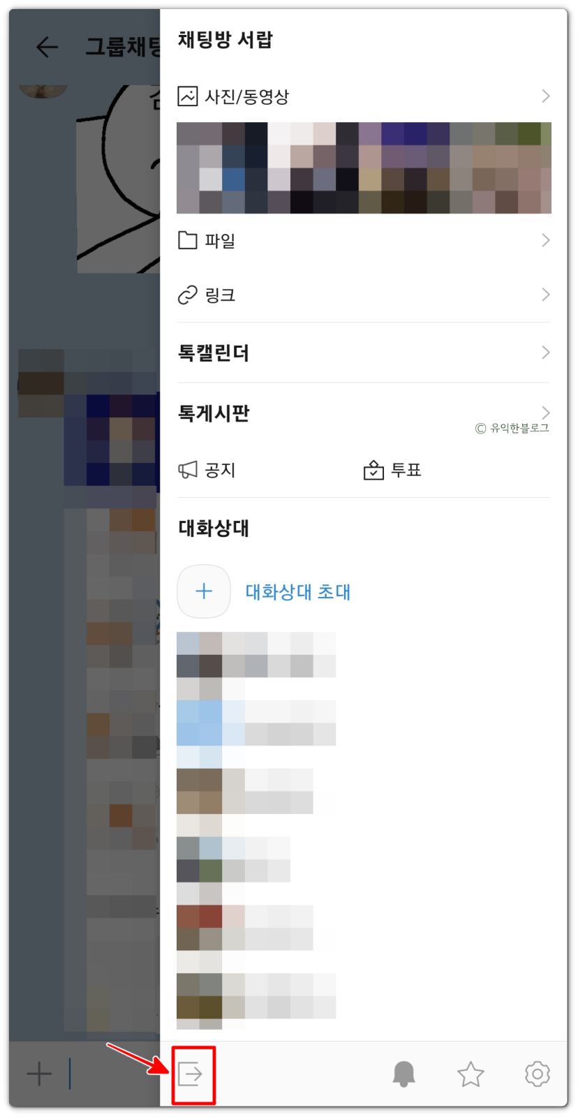 단톡방에서 오른쪽 상단에 있는 줄3개 아이콘을 누르면 채팅방 서랍이 뜨게 되는데, 여기서 하단 가장 왼쪽에 있는 나가기 아이콘을 선택해주세요.