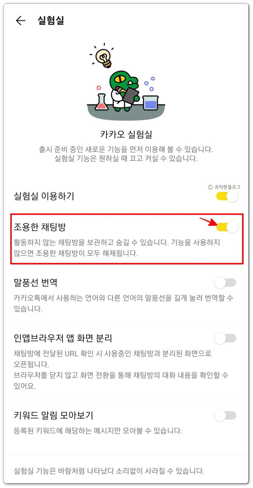 여러가지 메뉴들 중 하단에 있는 [실험실] 메뉴를 선택해 들어갑니다. 그리고 [조용한 채팅방] 이라고 되어 있는 부분을 활성화시켜주세요.