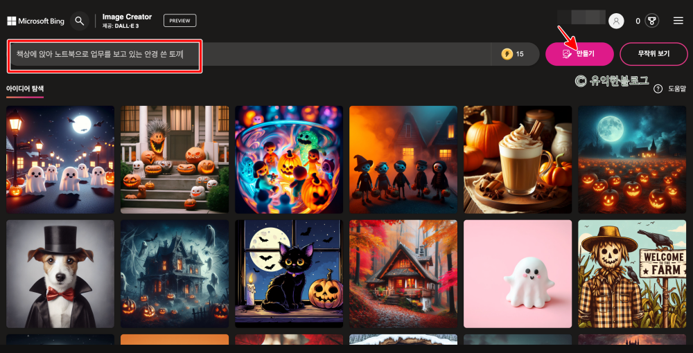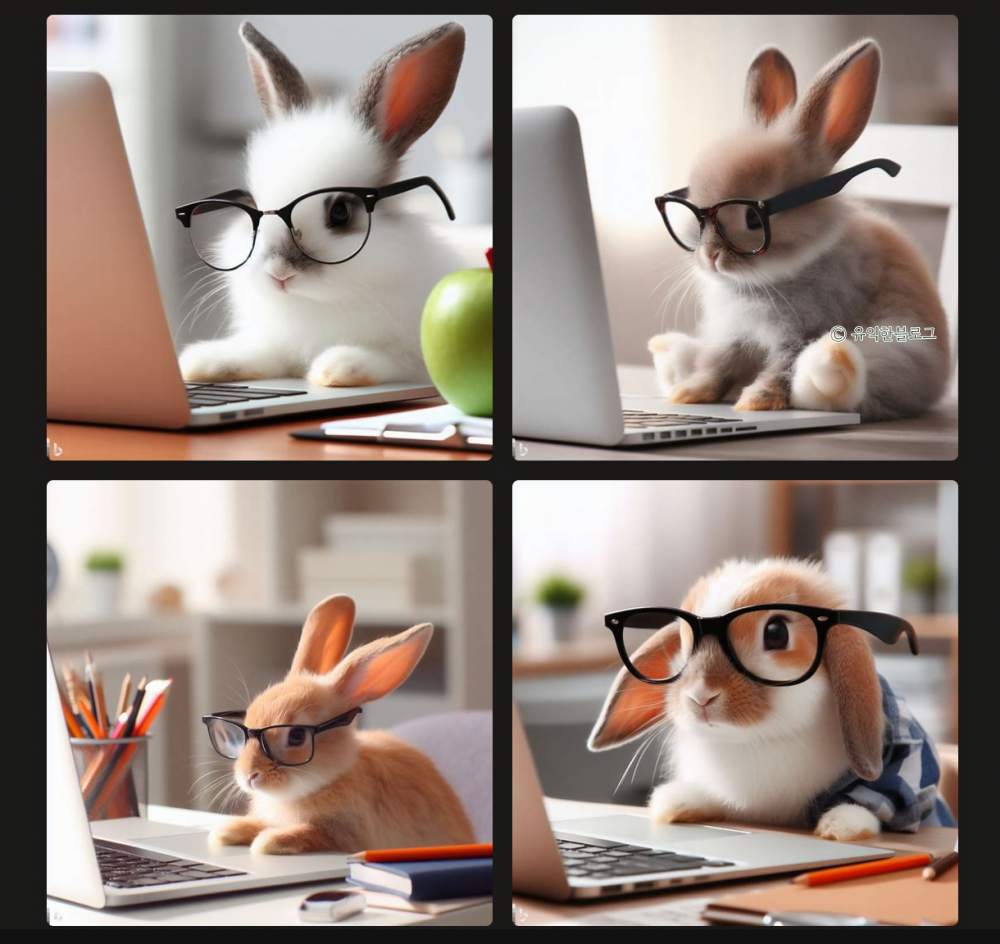저는 ‘책상에 앉아 노트북으로 업무를 보고 있는 안경 쓴 토끼’라고 입력해 보았네요. 입력을 마친 뒤 [만들기]를 눌러주면 됩니다.