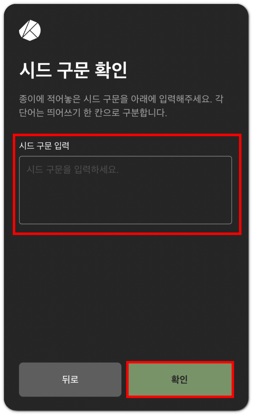 그리고 확인을 위해 방금 종이에 적어두었던 시드 구문을 다시 한번 입력해줍니다. 참고로 시드 구문은 여러 개의 단어로 이루어져 있고, 각 단어들은 띄어쓰기 한 칸으로 구분뒤어 있어요. 시드 구문을 입력한 뒤 '확인'버튼을 누릅니다.