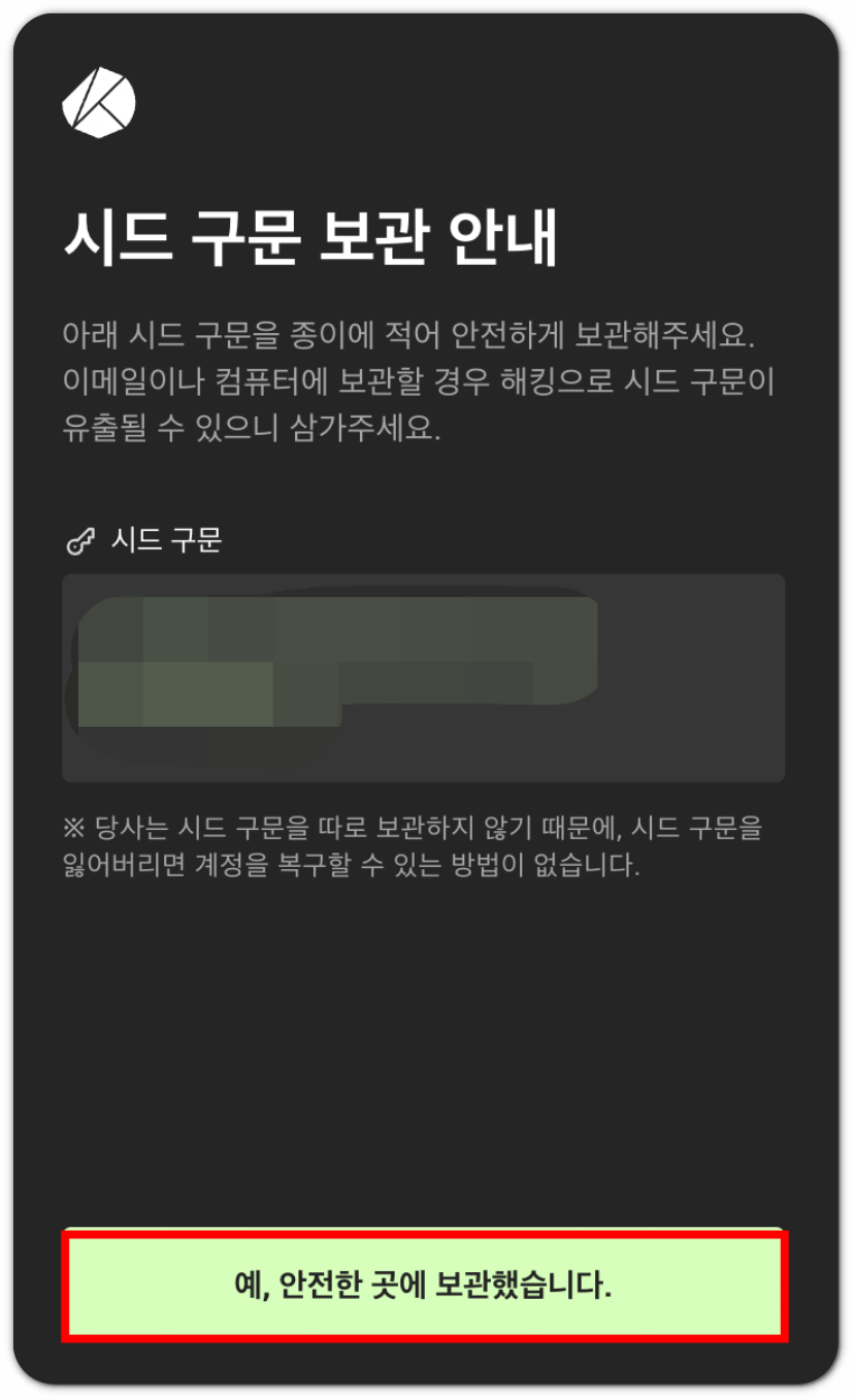 확인 버튼을 누르면 시드 구문을 확인할 수가 있습니다. 해당 시드 구문을 종이에 적어 보관하시면 됩니다. 컴퓨터나 스마트폰은 해킹의 위험이 있기 때문에 꼭!! 종이에 적어 잘 보관해두셔야 합니다. 시드 구문을 종이에 잘 옮겨 적은 후, '예, 안전한 곳에 보관했습니다.'버튼을 클릭해 주세요.