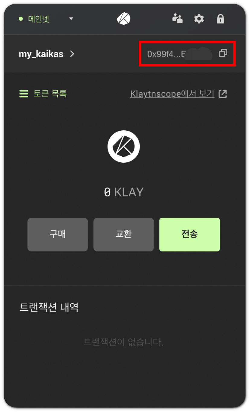 카이카스 지갑 만들기를 성공적으로 만든 뒤에는 브라우저 오른쪽 상단 kaikas 아이콘을 눌러 언제든 지갑을 확인할 수 있는데요, 오른쪽 상단 부분에서 본인의 카이카스 지갑 주소를 확인할 수 있습니다. 주소가 있는 부분을 클릭하면 자동으로 주소가 복사됩니다.