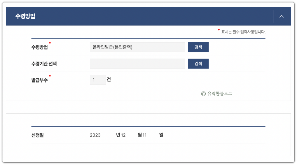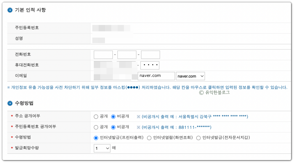 주소, 주민등록번호는 필요에 따라 공개 또는 비공개로 설정해주시면 되고, 수령방법은 ‘인터넷발급(프린터출력)’으로 선택해주시면 됩니다.