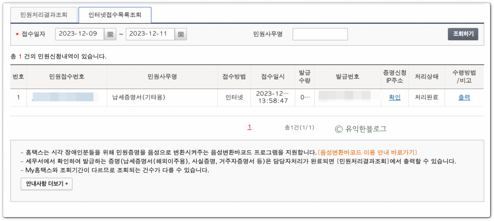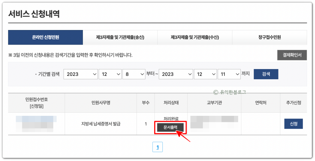 발급이 완료되면 아래와 같은 화면으로 이동하는데요, 오른쪽 끝에 있는 [출력] 버튼을 눌러줍니다.