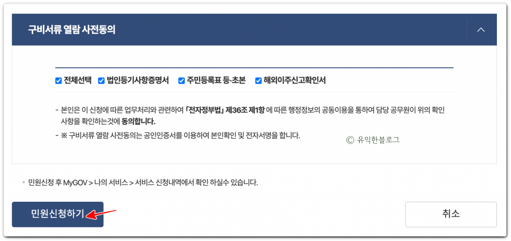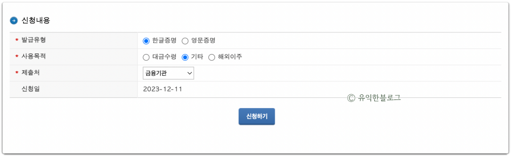 발급유형(한글/영문), 사용목적, 제출처 등도 목적에 맞게 입력한 다음, [신청하기] 버튼을 눌러주세요.