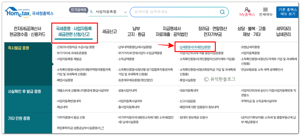 (홈택스 메인 화면 상단에 보이는 검색창에 ‘국세완납증명’이라고 검색하셔도 됩니다.)