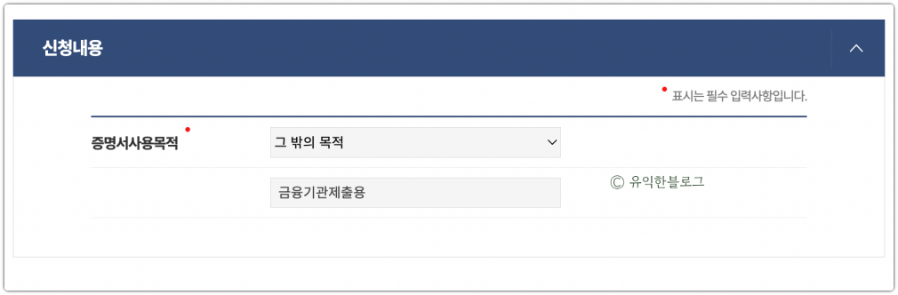 만약 대출 등의 목적으로 발급받는 거라면 [그 밖의 목적]을 선택한 뒤, ‘금융기관제출용’이라고 입력을 해 주시면 됩니다.