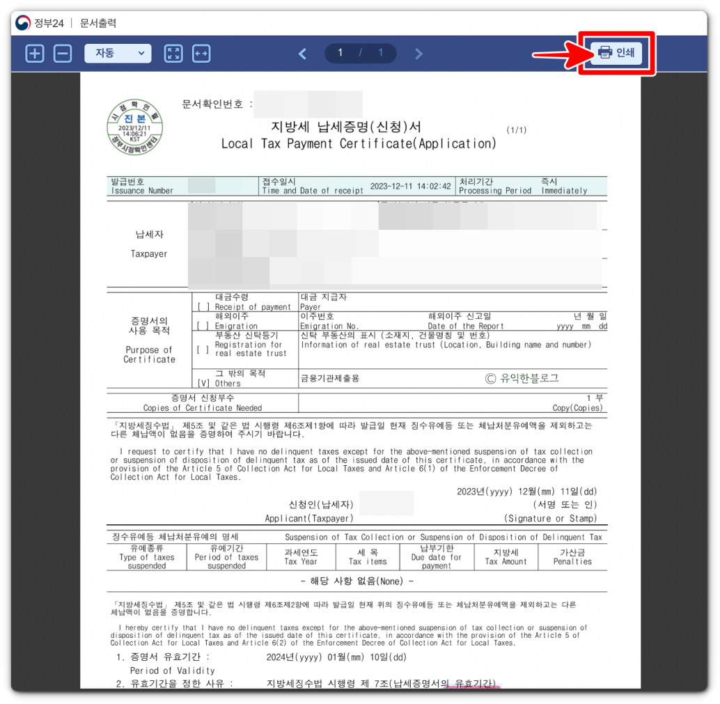 [인쇄] 버튼을 눌러 직접 출력을 하거나 pdf 파일로 저장을 해 주시면 돼요.