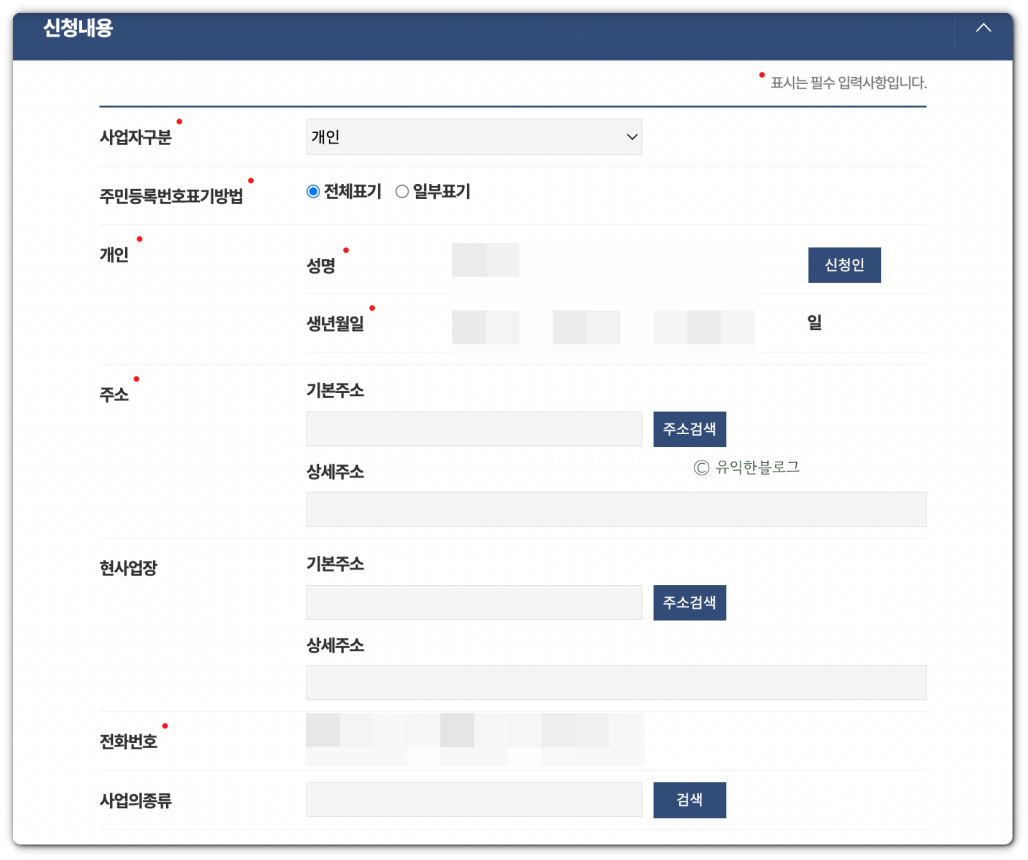 먼저 주소, 전화번호 등 인적사항을 입력합니다. 빨간 점으로 표시된 부분은 필수입력사항으로 반드시 입력하셔야 해요.