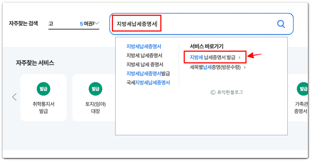 일단 로그인을 해 줍니다. 그리고 메인 화면에 보이는 검색창에 ‘지방세납세증명서’ 라고 입력하시면 아래와 같이 바로가기 메뉴가 뜨는데요, [제방세 납세증명서 발급]을 클릭해줍니다.