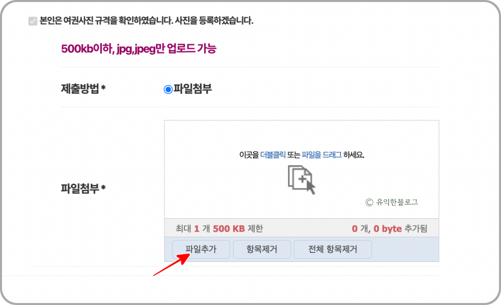 그러면 이렇게 파일 업로드 화면이 표시되는데요. [파일추가] 버튼을 눌러 사진을 업로드하면 됩니다.