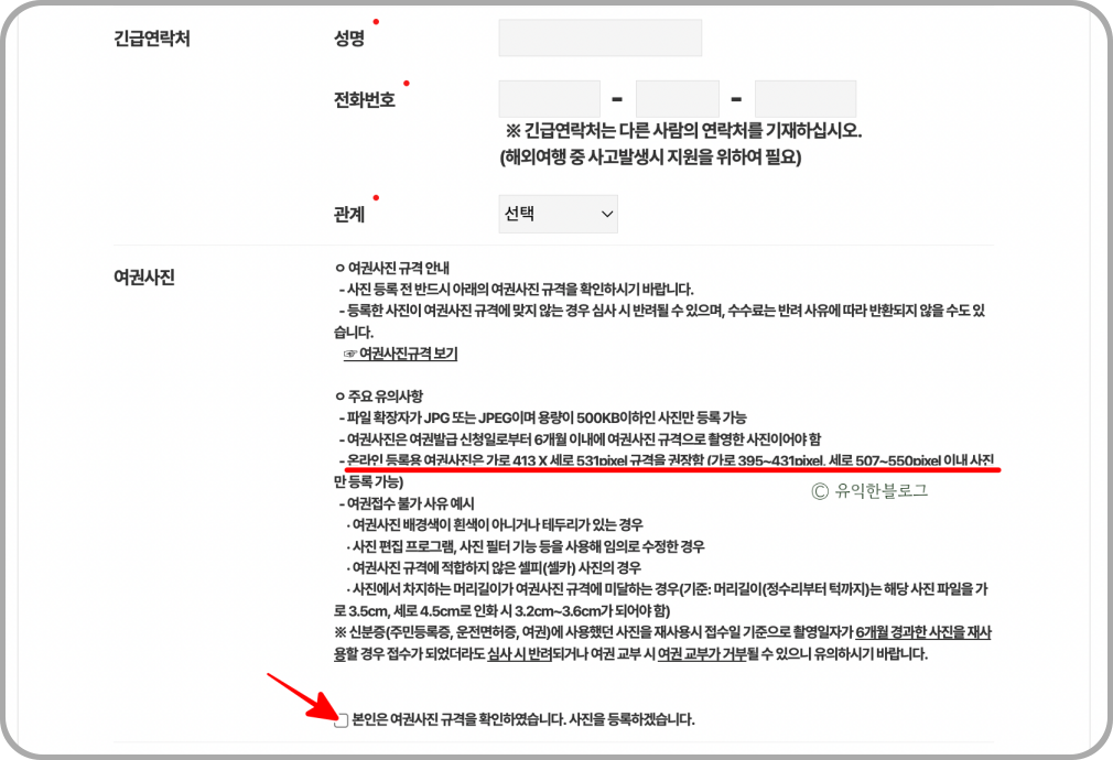 긴급연락처를 입력한 다음, 여권사진 유의사항을 읽어보고 하단에 있는 [본인은 여권사진 규격을 확인하였습니다. 사진을 등록하겠습니다.] 라고 되어있는 부분을 체크합니다.