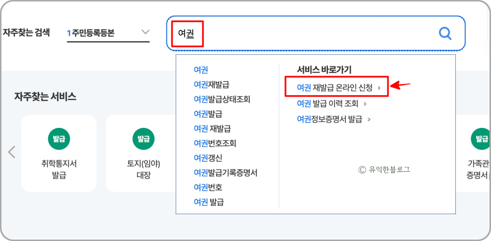 정부 24 사이트 접속 후 로그인을 한 다음, 메인 화면의 검색창에서 ‘여권’이라고 입력을 합니다. 그러면 ‘여권 재발급 온라인 신청’ 이라는 메뉴가 뜨는데요, 이걸 클릭해주세요.