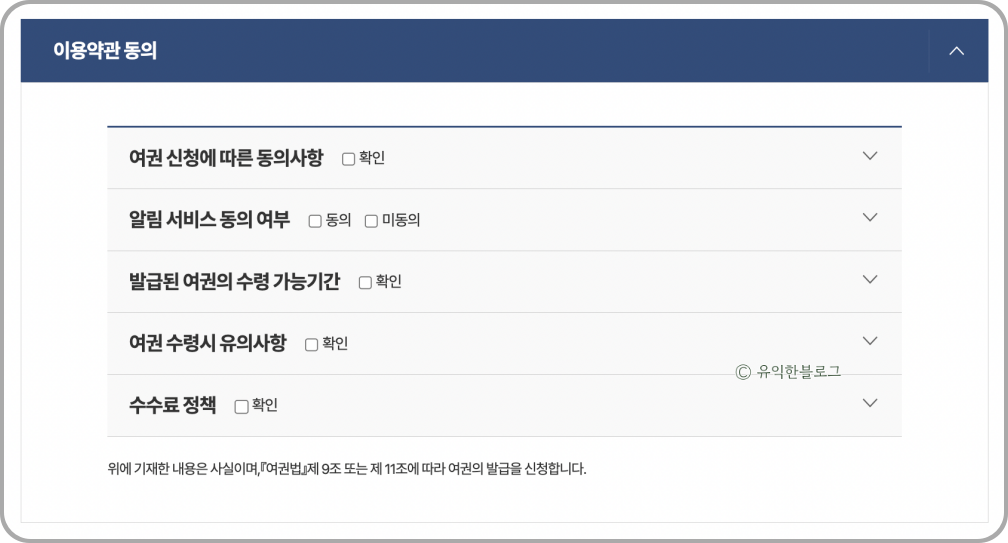 이용약관에 동의를 해 줍니다. 여권 수령시 유의사항 부분은 한번쯤 읽어보시는 게 좋아요.