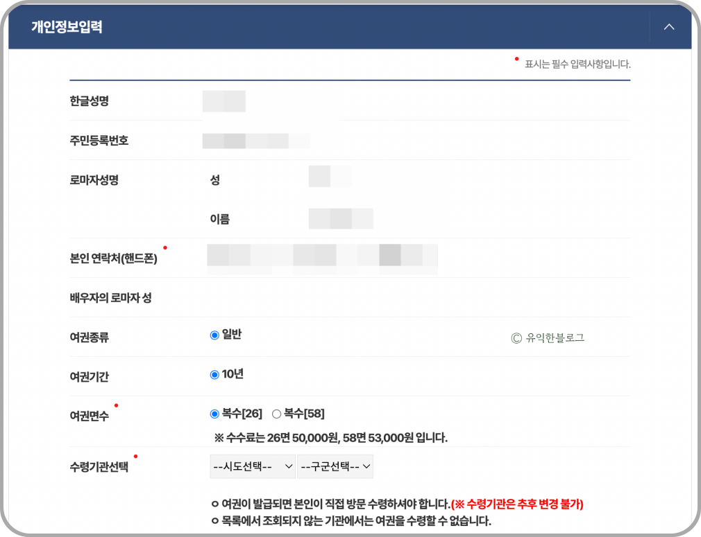 다음으로는 연락처 등 개인정보를 입력하고, 여권 면수를 선택합니다. 그리고 나중에 수령할 기관도 선택해주세요.