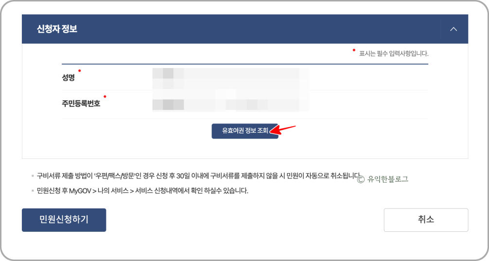 ‘신청자 정보’ 란에 내 이름과 주민번호가 뜨게 되는데요, [유효여권 정보 조회] 버튼을 클릭합니다.