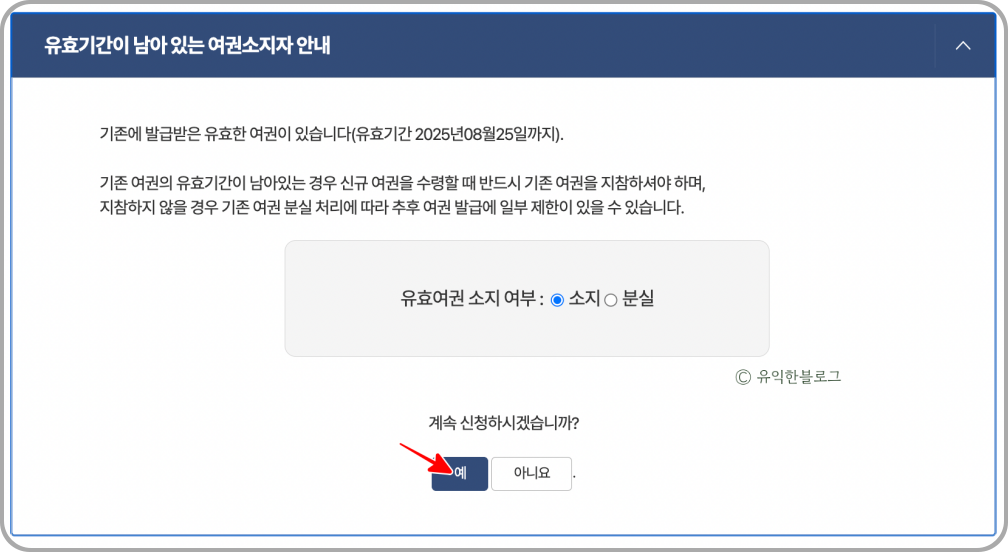 아직 유효기간이 남아 있는 경우 아래와 같은 화면이 뜨는데요. 유효여권 소지 여부에 체크를 하고 [예] 버튼을 누릅니다.