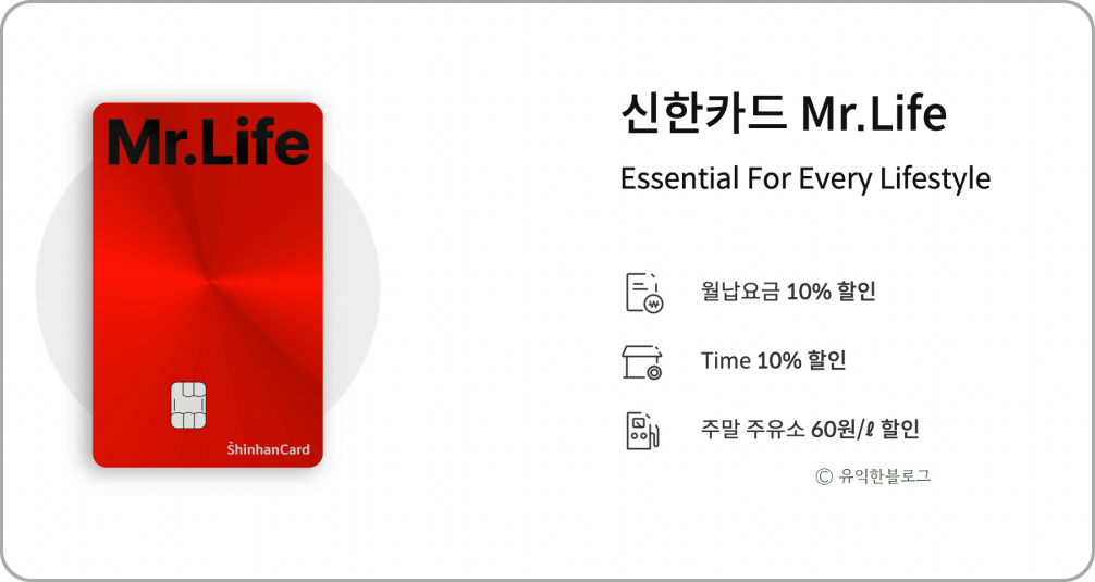 이번 글에서는 혜택 좋은 신용카드로 많은 분들이 이야기하는, ‘신한카드 미스터라이프’ 혜택에 대해 살펴보려고 합니다.