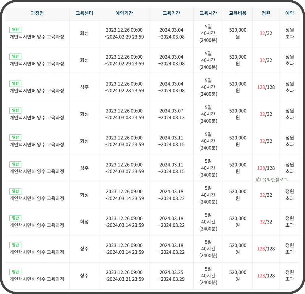 실제로 개인택시 양수교육을 신청해본 분들의 이야기에 따르면 예약하는 게 꽤나 치열하다고 합니다.