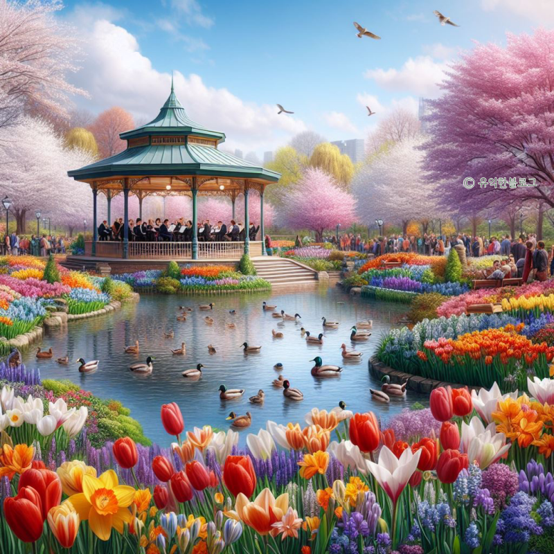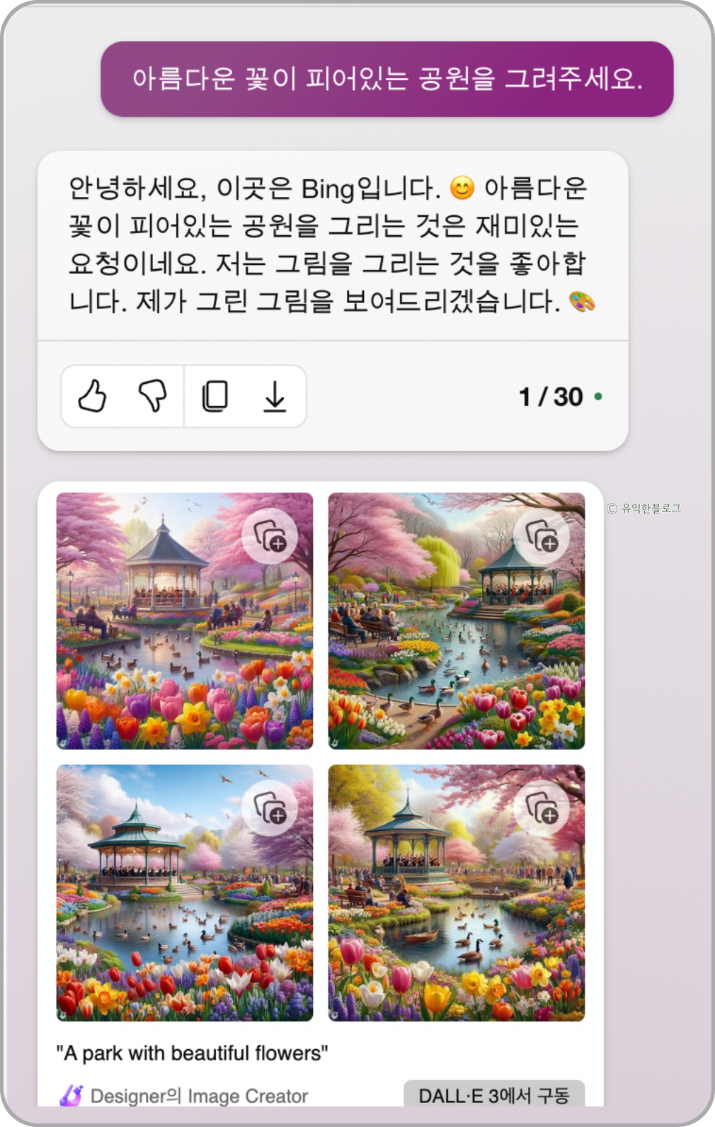 저는 ‘아름다운 꽃이 피어있는 공원을 그려주세요.’라고 요청을 해 보았는데요. 아래와 같이 4장의 이미지를 생성해 주었습니다.