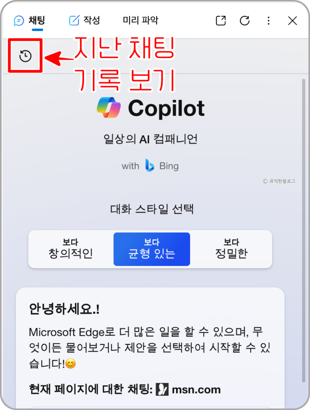 참고로 채팅 기록을 보려면 왼쪽 상단에 있는 시계모양 아이콘을 클릭하시면 됩니다. 코파일럿과 나누었던 모든 대화를 확인하실 수 있어요.