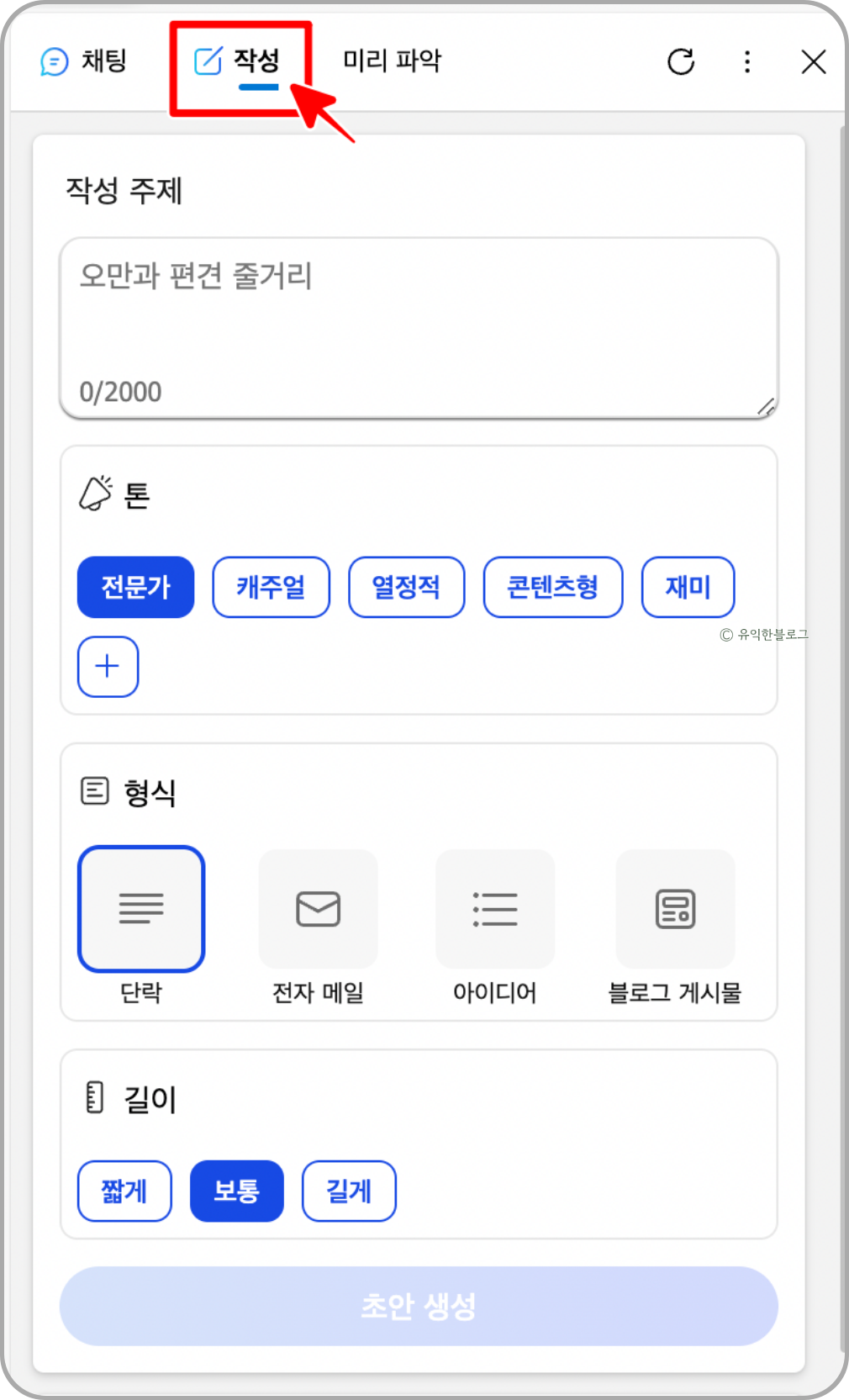 작성 주제, 톤, 형식, 길이 등을 설정한 뒤 [초안 생성] 버튼을 누르시면, 코파일럿이 알아서 컨텐츠를 생성해줍니다.
