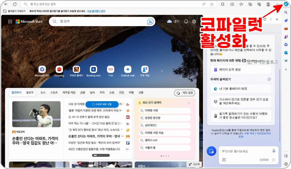 코파일럿을 이용해 현재 화면에 보이는 뉴스기사를 요약할 수 있습니다.