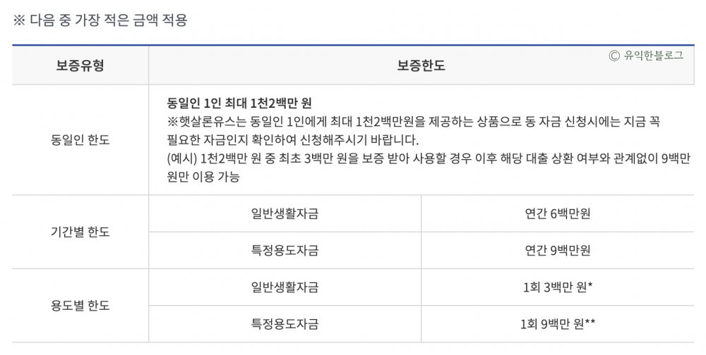 일단 총 보증한도는 동일인 1인 최대 1,200만원까지입니다. 또한 종류가 일반생활자금인지, 특정용도자금인지에 따라 한도가 다릅니다.