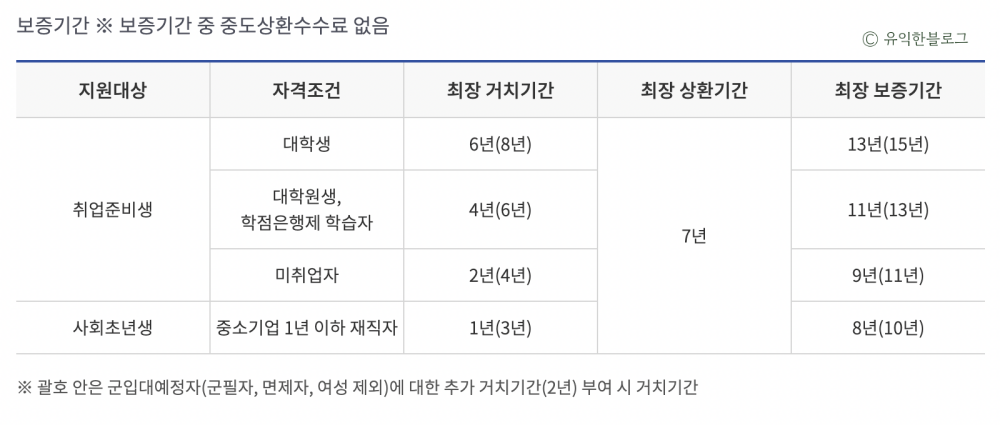 대학생의 경우 최장 거치기간 6년, 최장 상환기간 7년, 최장 보증기간 13년입니다. 군입대예정자의 경우 거치기간 및 보증기간이 추가로 2년 늘어납니다.