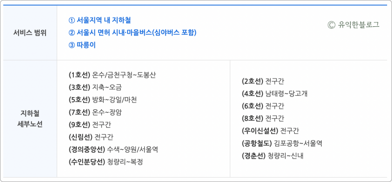 다만, 요금체계가 다른 신분당선, 서울 외 지역의 지하철 및 버스, 광역/공항버스는 이용이 불가능해요.