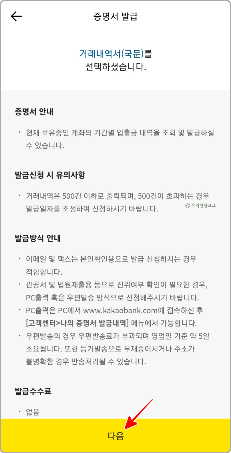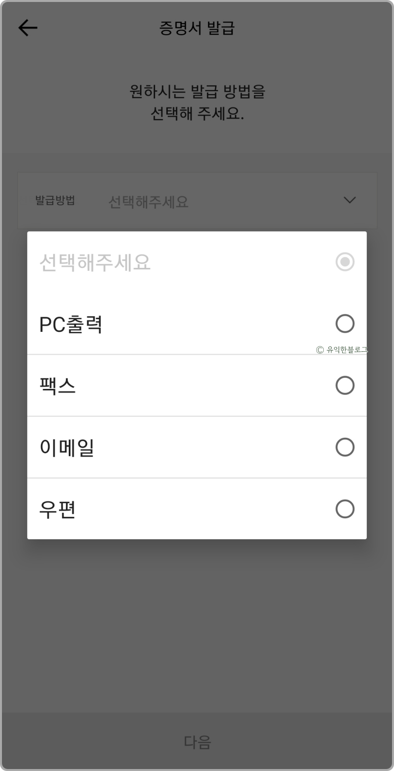 [다음] 버튼을 누릅니다. 그리고 원하는 발급 방법을 선택해 주세요.