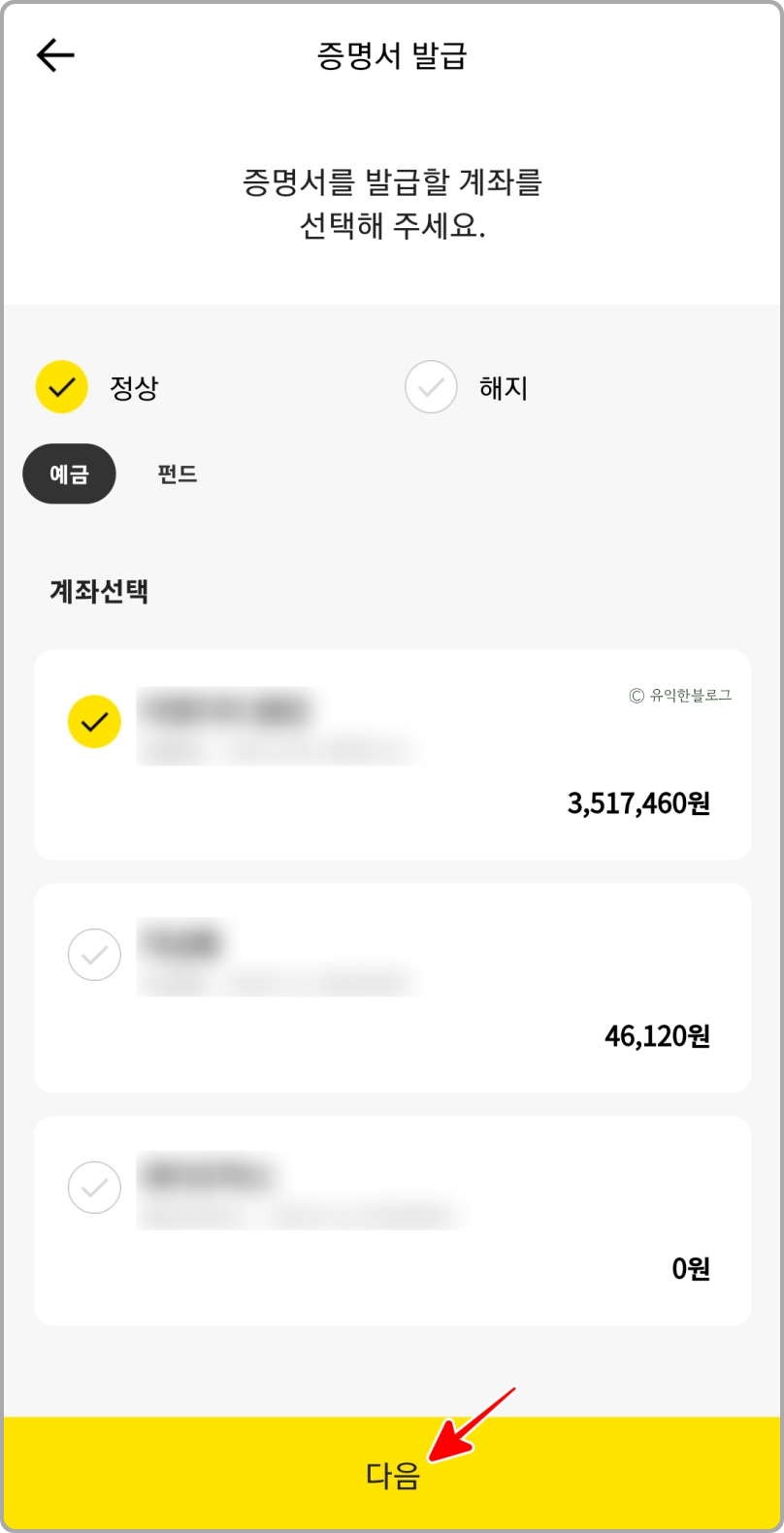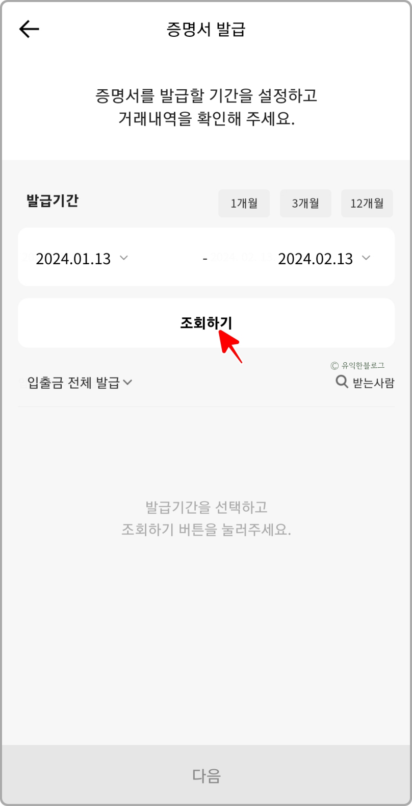 증명서를 발급할 계좌를 선택하고, [다음] 버튼을 누릅니다. 그리고 발급 기간을 설정해 [조회] 버튼을 터치합니다.