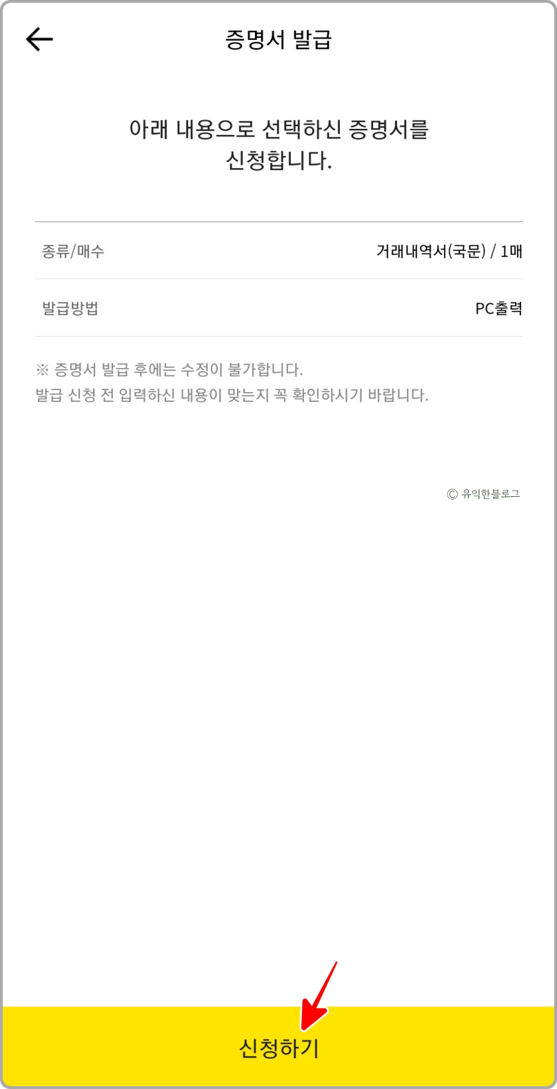 내역이 조회되면 [다음]을 눌러주세요. 그리고 [신청하기]를 터치합니다. 이후 인증 비밀번호를 입력하면, 증명서 신청이 완료됩니다.