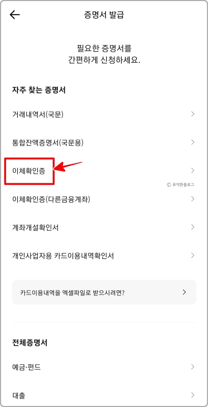 (거래내역서가 보이지 않을 경우, [전체증명서] 섹션에 있는 [예금, 펀드] 메뉴 선택하시면 찾을 수 있습니다.)