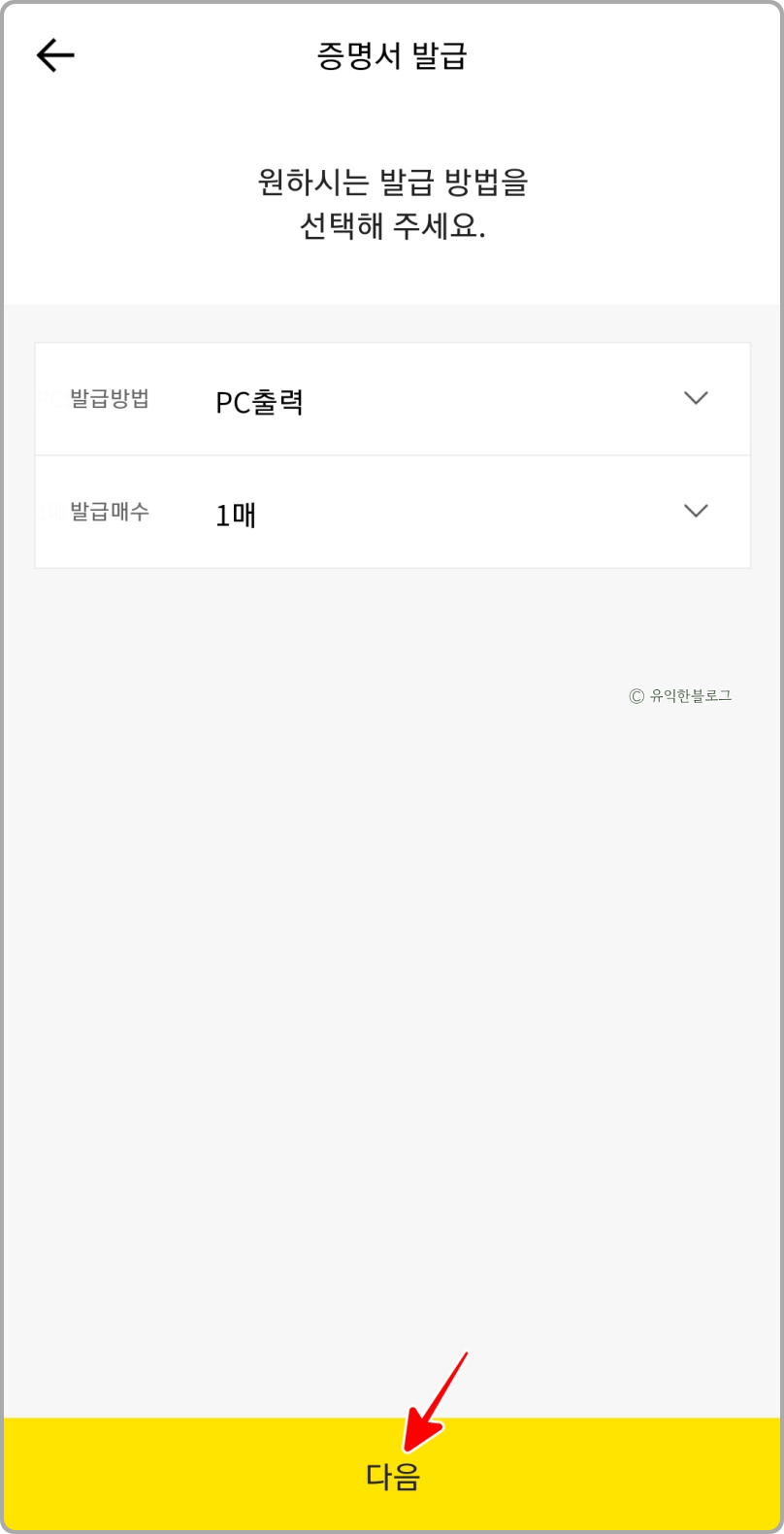 원하는 발급 방법을 선택하고, 발급 매수를 설정한 다음, [다음]을 누릅니다. 저는 PC출력으로 진행할게요.