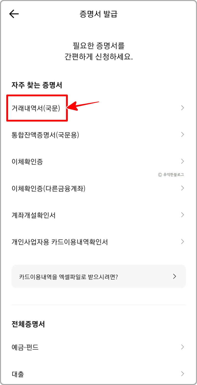 그러면 다양한 메뉴가 뜨게 되는데요. 이 중 [증명서 발급] 이라고 되어 있는 메뉴를 선택합니다. 여기서 [거래내역서(국문)] 이라고 되어 있는 부분을 터치해 주세요.
