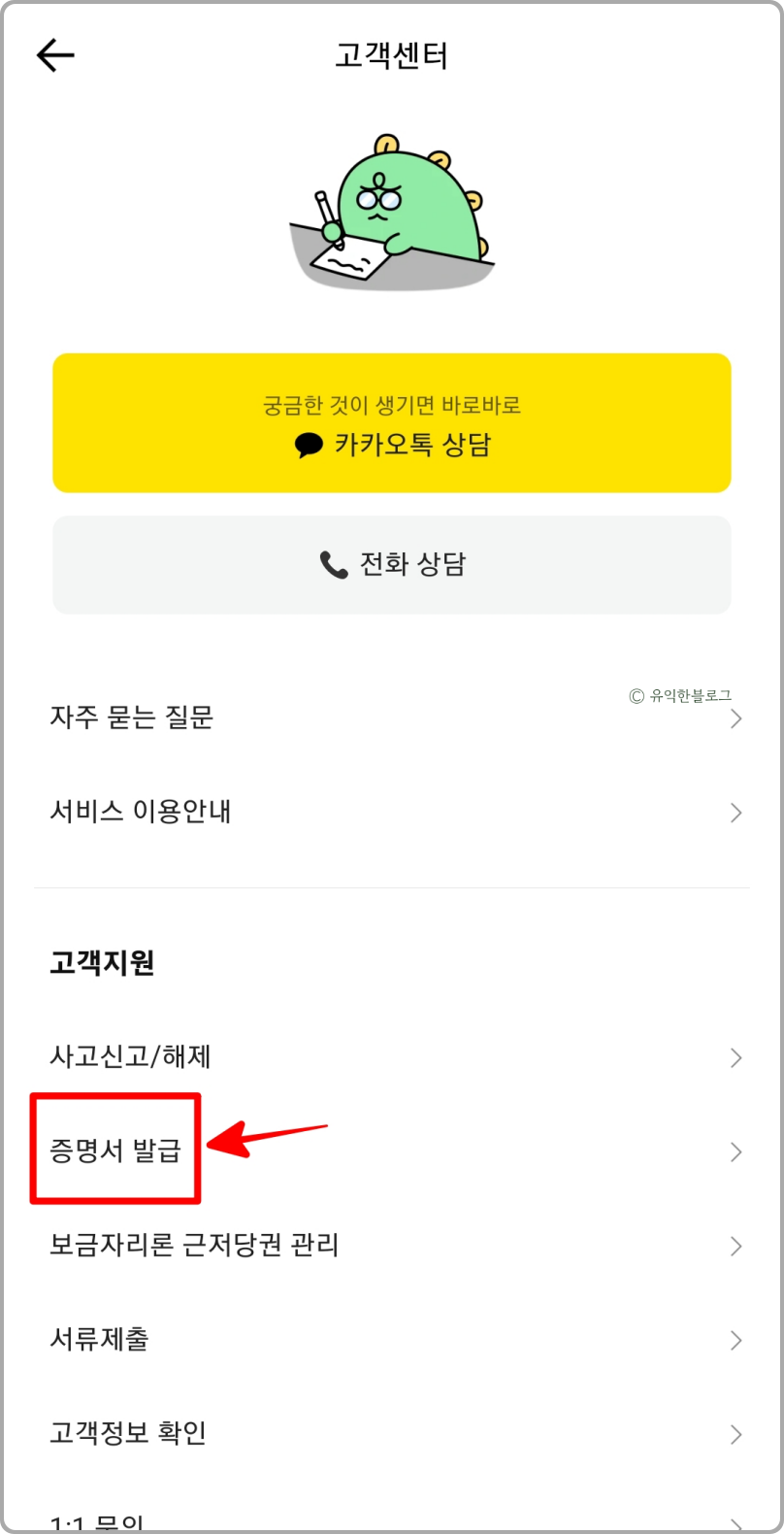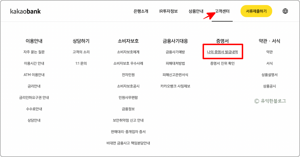 우측 상단의 [고객센터]에 마우스를 가져가면 메뉴가 뜨게 되는데요, [증명서]라고 되어 있는 곳의 [나의 증명서 발급 내역]을 선택합니다.