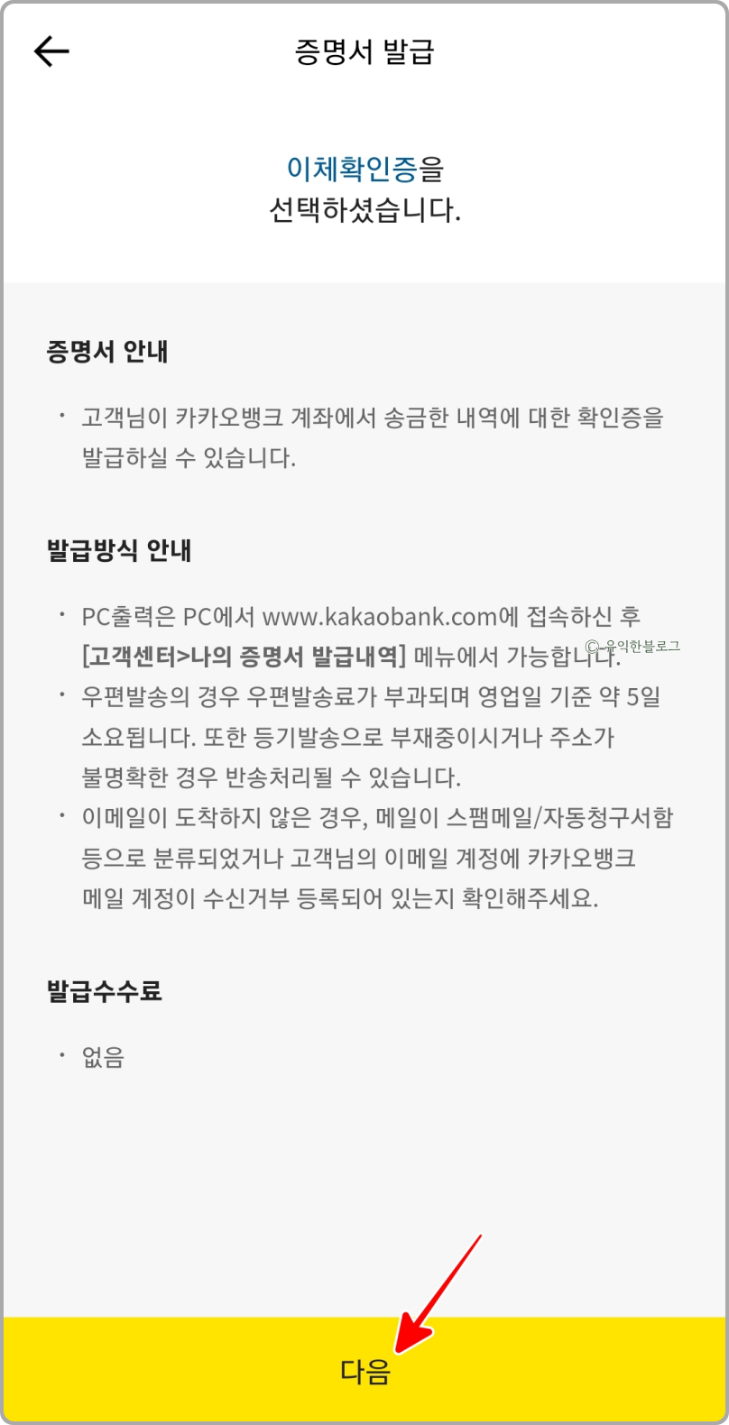 아까 [증명서 발급] 메뉴에서 [이체확인증]을 선택하시면 됩니다. 그리고 [다음] 버튼을 눌러주세요.