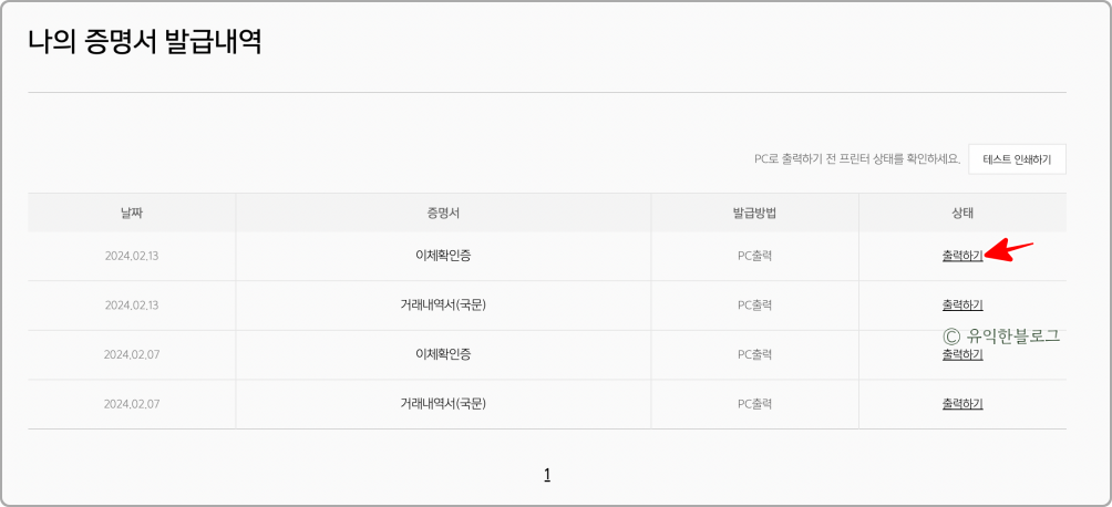 로그인이 되면, 아까 신청했던 증명서 목록이 보입니다. 원하는 증명서를 선택하고, <출력하기> 버튼을 눌러 PC에 연결된 프린터로 증명서를 출력해 주시면 됩니다.