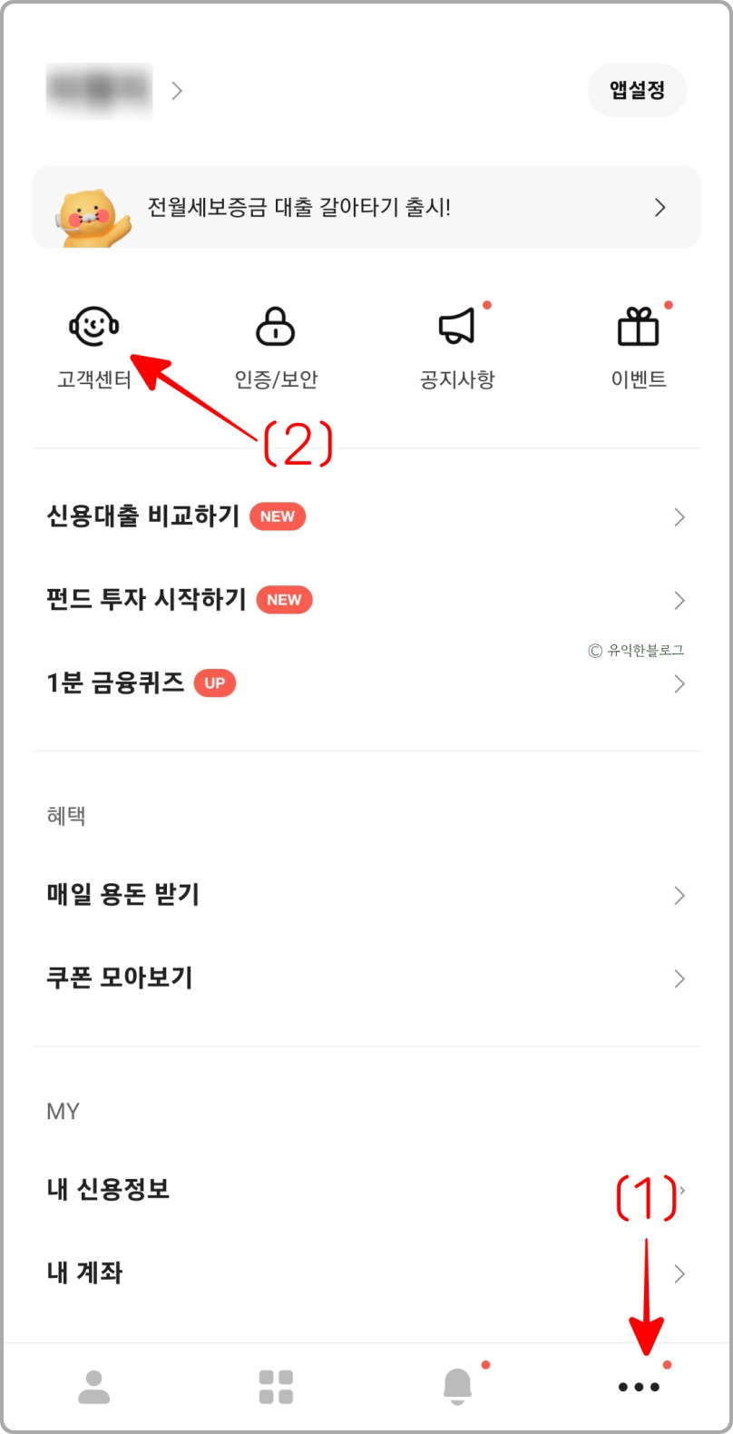 먼저 카카오뱅크 앱을 실행해 주세요. 그리고 하단 가장 맨 오른쪽에 있는 점3개 아이콘(더보기 아이콘)을 터치합니다. 그리고 상단에 있는 [고객센터] 아이콘을 눌러주세요.