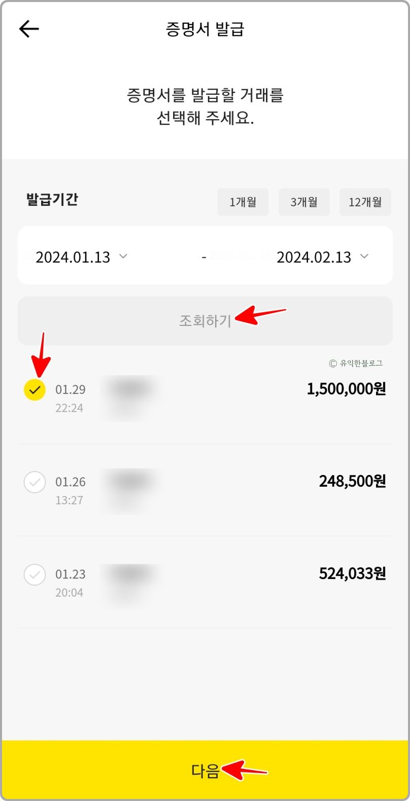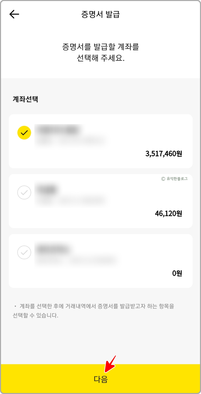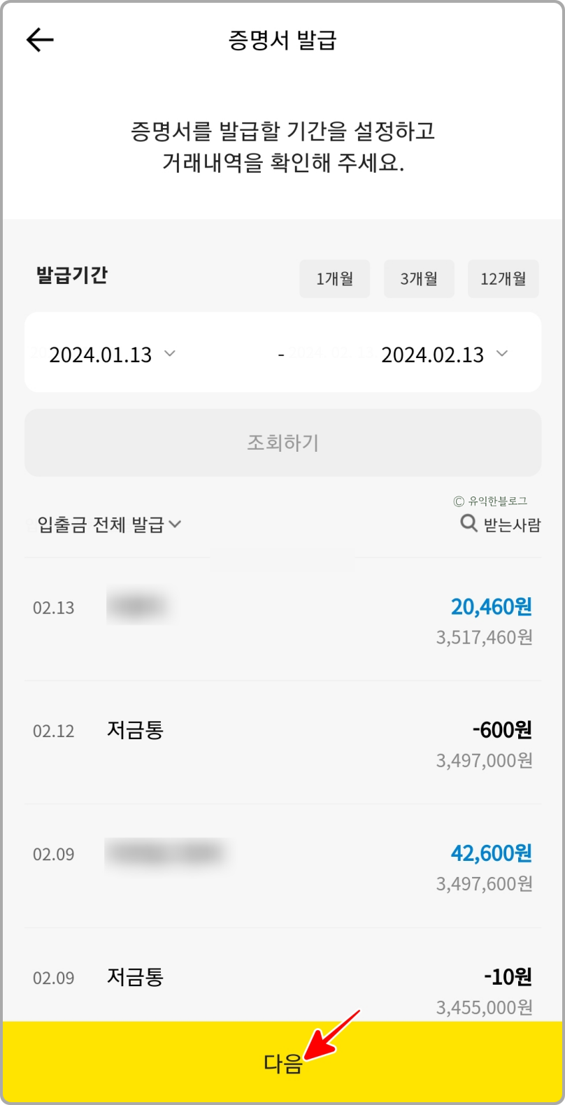 발급할 계좌를 선택하고, [다음]을 누릅니다. 그리고 기간을 조회해서 이체확인증을 발급할 거래내역을 선택해 주세요. 선택을 마쳤다면 [다음] 을 터치해 줍니다.