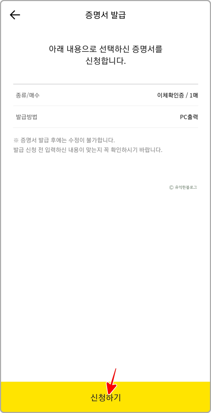마지막으로 [신청하기]를 누르고, 인증번호를 입력하면 카카오뱅크 이체확인증 발급 신청이 완료됩니다.