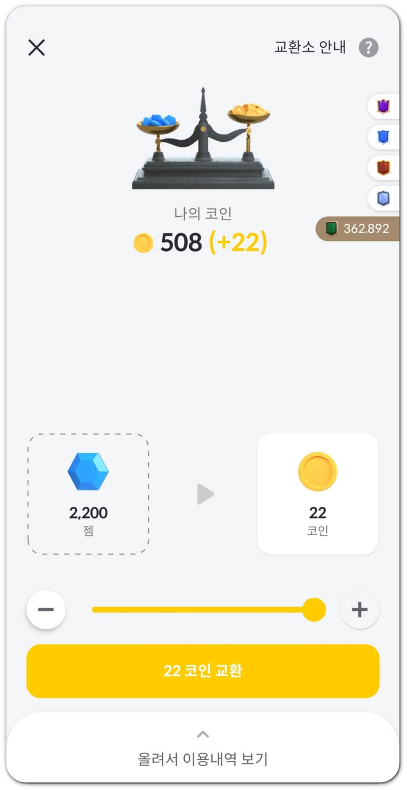 이렇게 얻은 젬이 모이면 코인으로 교환할 수가 있는데요, 이렇게 교환받은 코인을 이용해 상점에서 상품을 살 수 있습니다. 참고로 100젬당 1코인으로 교환이 됩니다.