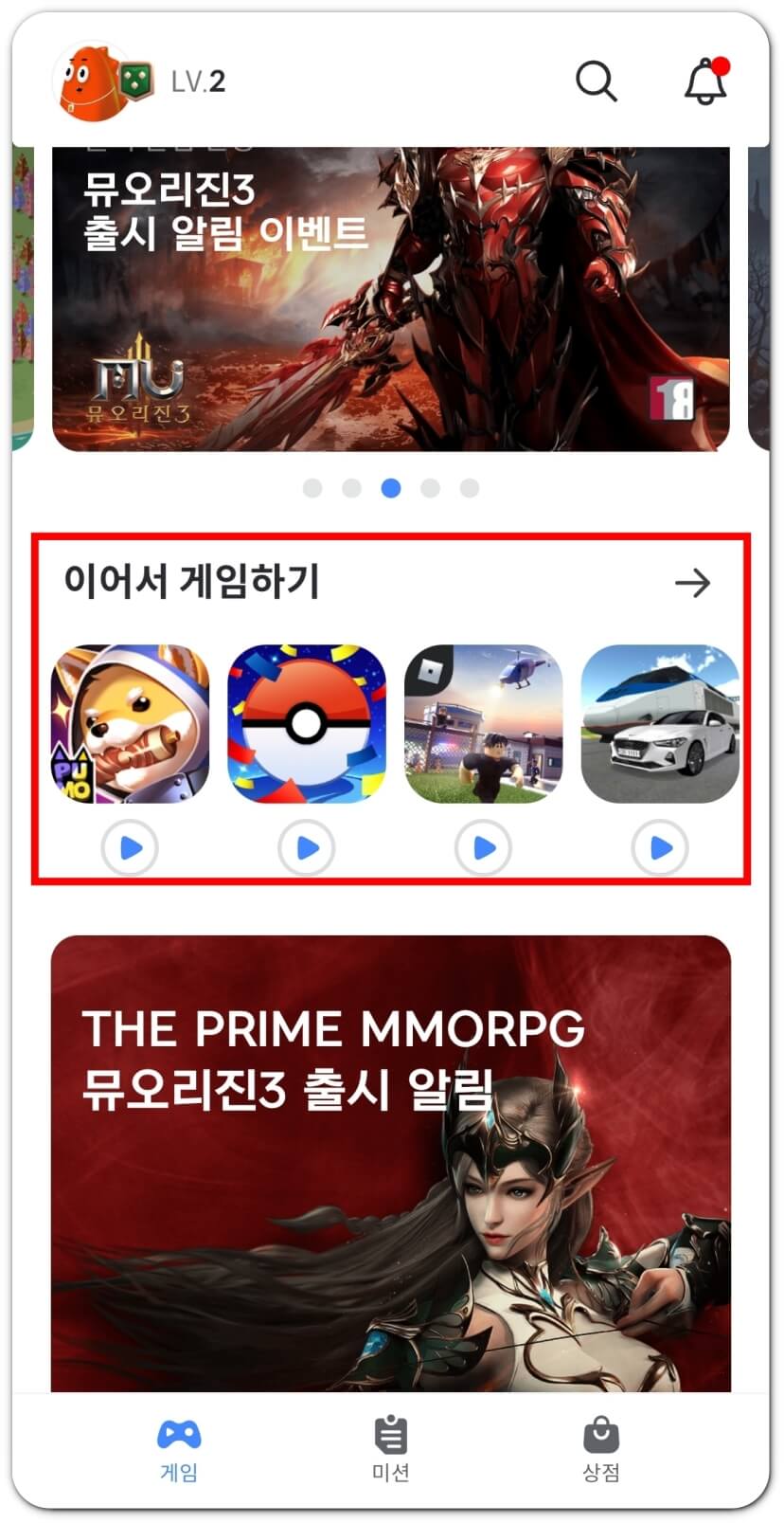 플레이오 접속 후 메인 화면에서 상단 오른쪽에 있는 돋보기 모양 아이콘을 누르면 플레이 시 젬을 적립받을 수 있는 게임 목록을 확인할 수 있습니다. 직접 게임을 검색해 찾아볼 수도 있고요. 이미 설치되어 있는 게임의 경우 메인 화면에 ‘이어서 게임하기’라는 섹션에 자동으로 뜨더라고요. 전 로블록스, 닌자 키우기, 포켓몬고 등의 게임을 평소 즐겨 했었는데 자동으로 뜨는 걸 확인할 수 있었습니다.