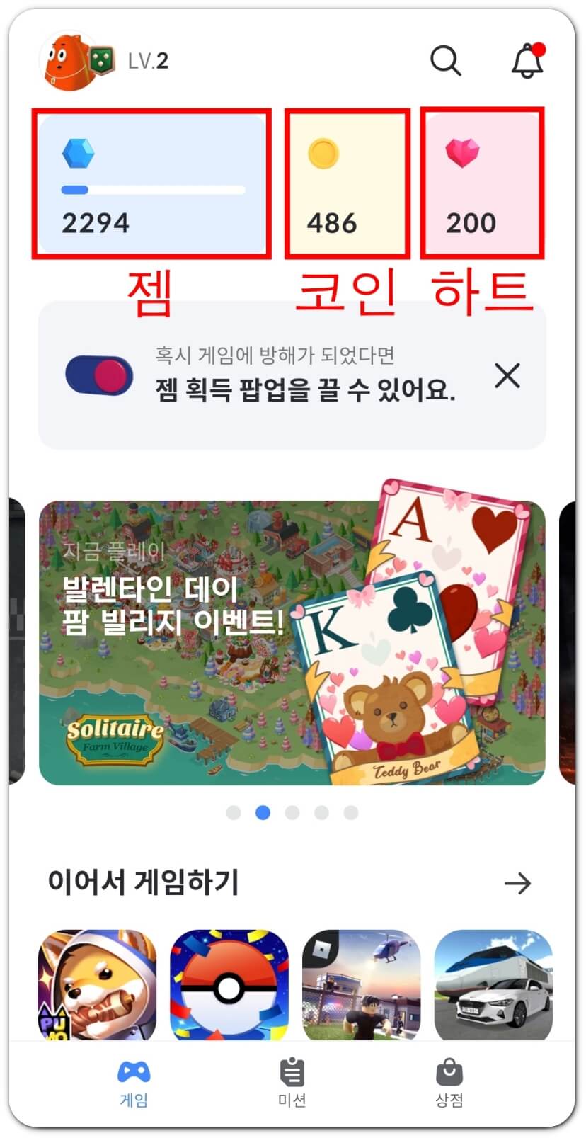 참고로 게임 목록을 보면 게임별로 표시되어있는 젬의 개수가 다른 것을 볼 수 있습니다. 어떤 게임은 젬 5개, 어떤 게임은 젬 2개 이런 식으로요. 5개의 젬이 표시된 5젬 게임을 하면 좀 더 많은 젬을 얻을 수 있어요.