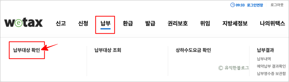 위택스 사이트에 접속하여 일단 로그인을 해 줍니다. 그리고 상단 메뉴 중 [납부]에 마우스를 가져간 다음, 아래에 뜨는 메뉴 중 [납부대상 확인]을 클릭해 주세요.