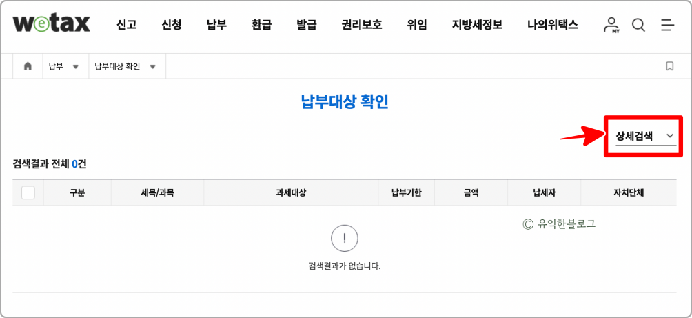 더 이전의 체납 내역을 확인하고 싶다면, [상세검색] 이라고 되어 있는 부분을 눌러주세요.