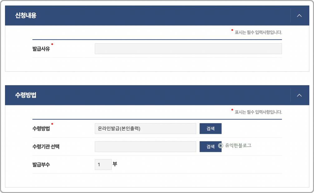 [발급사유]란에는 ‘기관 제출용’ 등 간단하게 입력을 하시면 되고, 수령방법은 [온라인발급(본인출력)]으로 하셔야 직접 프린터하거나 pdf 저장이 가능합니다.