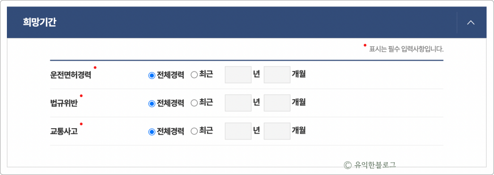 신청 화면으로 이동하게 되는데요. 먼저 희망기간을 선택할 수 있습니다. ‘전체경력’으로 놓고 발급받아도 되고, 제출할 기간에서 요구하는 기간이 있다면 해당 기간을 입력하면 됩니다.