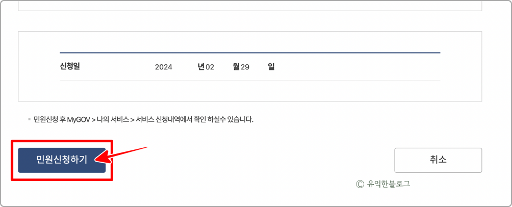 마지막으로 하단의 [민원신청하기] 버튼을 누르면 바로 발급이 됩니다.